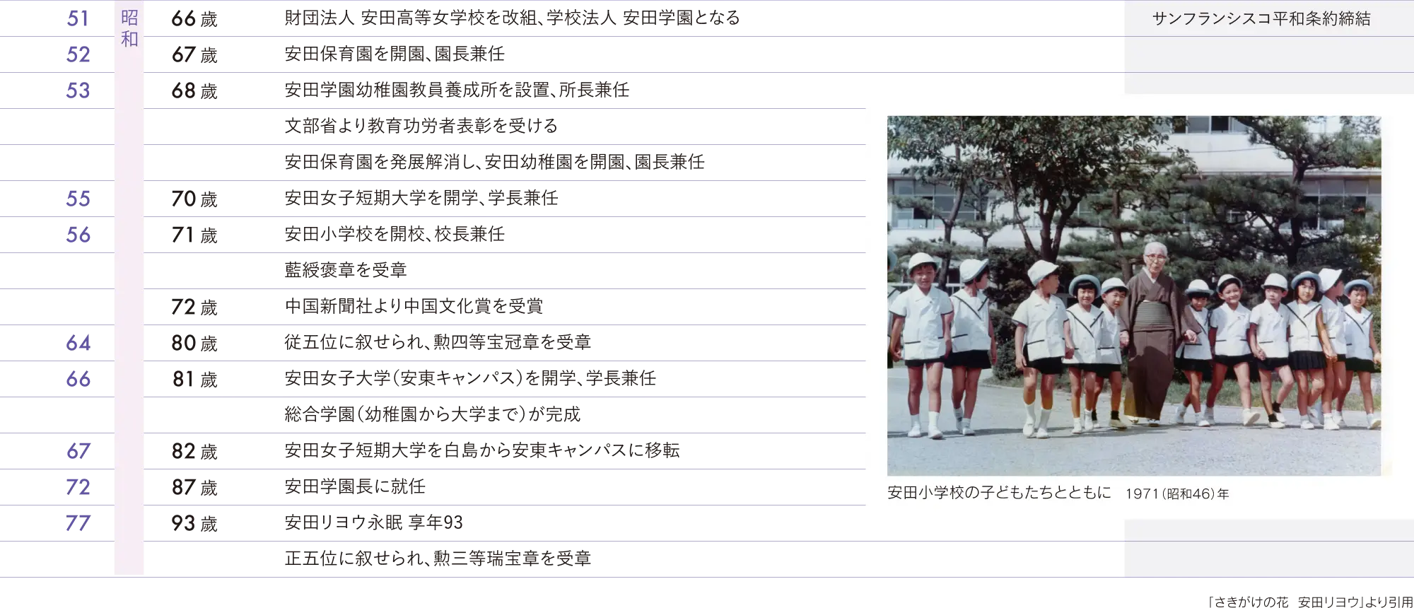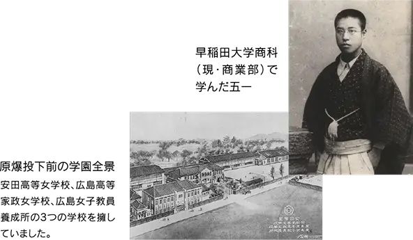 「幼稚園から大学までの総合学園で一貫教育を」五一が生前抱いていた夢はリヨウに受け継がれ、実現の時を迎えます。その後もリヨウは学園の発展に尽力し、未来へ続く安田学園の礎を築きました。