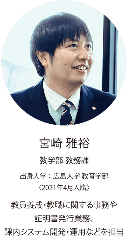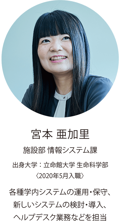 現在、教務課に所属していますが、教学の知識や学⽣対応など、⼀から学ぶことができました。この経験は今後の業務にも役⽴ちそうです。