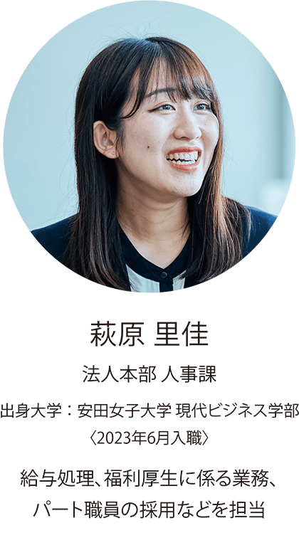 入職当日まで人事課に配属されるとは思ってもみなかったので、イメージしていた学生対応の業務とは異なり戸惑いましたが、今では毎月の給与業務が一段落する度にこの仕事向いてるな、と感じるぐらいに馴染んでいます。
